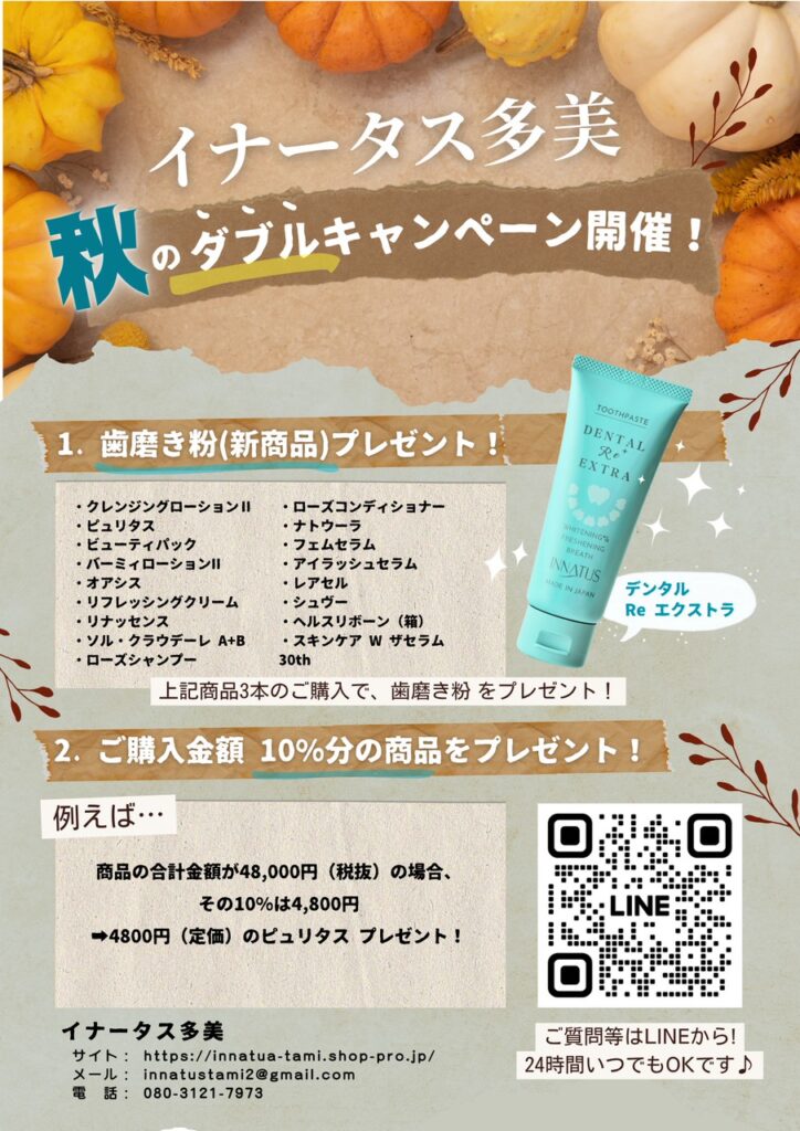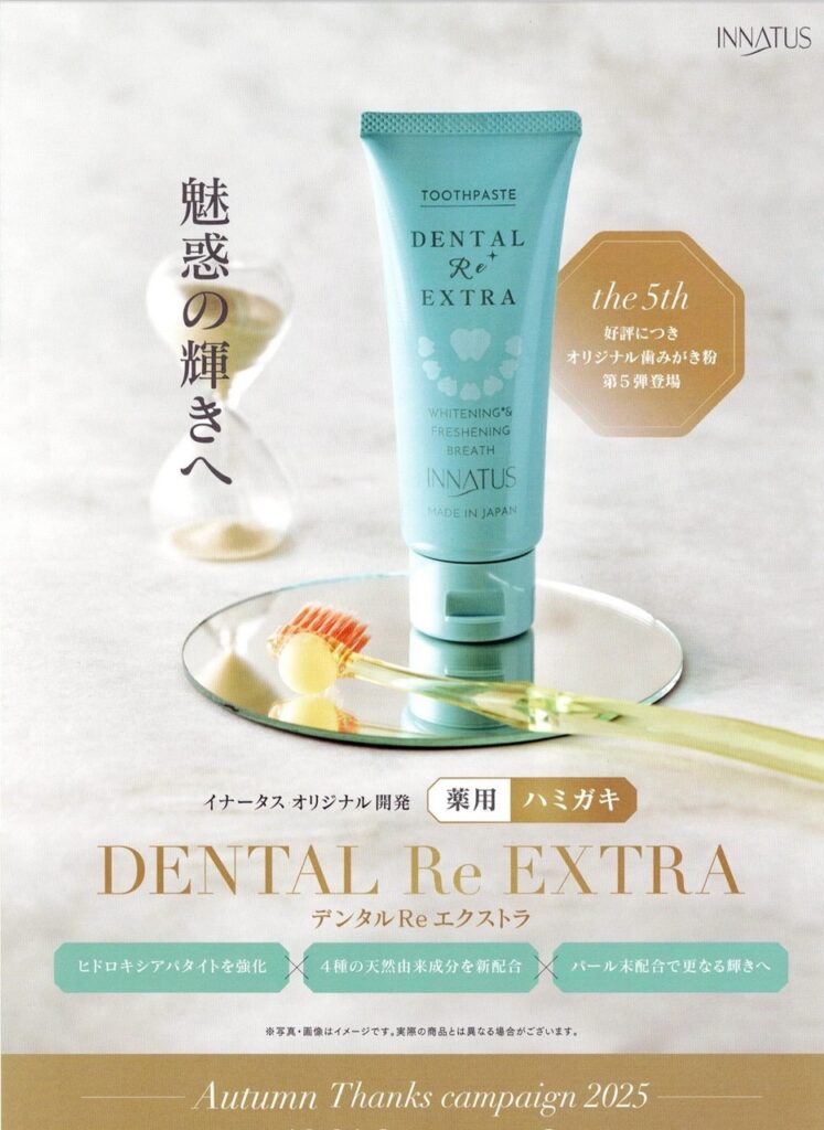 【最新情報・キャンペーン】 ✦ 秋のダブルキャンペーン ✦ 【キャンペーン開催期間】11月30日まで ①対象商品をご購入につき、新作歯磨き粉・「デンタル Re エクストラ」をプレゼント! ②ご注文金額の10パーセント分の商品をプレゼント! ↓ 詳しくは下記の画像をご確認ください。