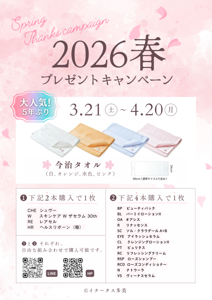 【最新情報・キャンペーン】 2026春 プレゼントキャンペーン🌸 こんにちは、イナータス多美です。 春のプレゼントキャンペーンを開催いたします🌸 対象商品のご購入につき、大人気『今治タオル』をプレゼント!約五年ぶりにアメニティとなりました。【期間】3/21~4/21